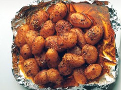 - Sett formen i stekeovn ved 200 °C, eller legg folien med poteter opp på grillen.