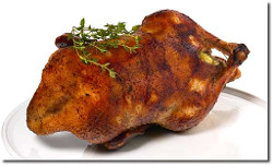 - Ente ca. 10 Minuten vor Ende der Garzeit zuletzt mit Bratenfond begießen, damit die Haut kross wird.