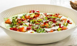 - Fordel suppen i skåler og topp med de finkuttede grønnsakene.